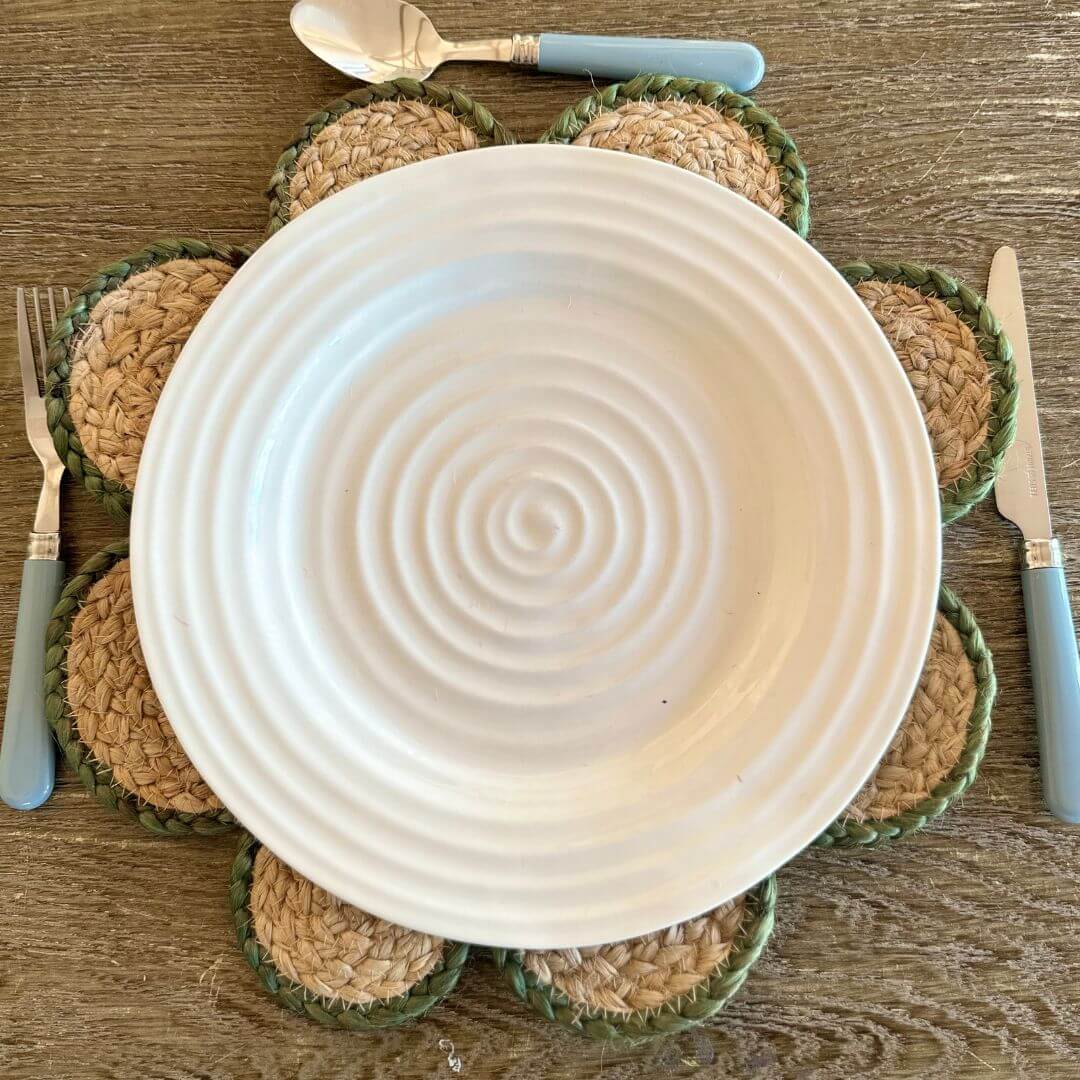 A stunning scalloped edged placemat made from 100% jute. The deep emerald border adds a perfect pop of colour to your dining table. Match with our Green Bobble Tumblers & Wine glasses.